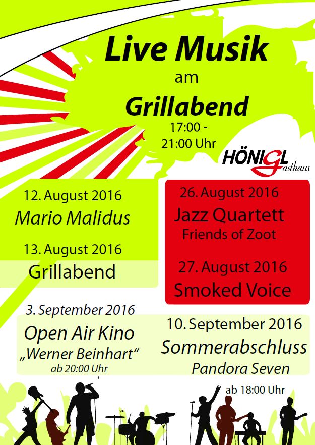 Aufgrund der großen Nachfrage bei unseren Open-Air-Veranstaltungen im Gastgarten gehen wir im August in die Verlängerung, und zwar am Freitag, den 12. August von 17.00 bis 21.00 Uhr mit Mario Malidus. Am Samstag, 13. August gibt es von 17.00 bis 21.00 Uhr ein Grillbuffet. Jeder nimmt sein eigenes Instrument mit und spielt auf. Am Freitag, den 26. August spielt von 17.00 bis 21.00 Uhr das Jazz-Quartett „Friends of Zoot“. Am Samstag, den 27. August sorgt „Smoked Voice“ wieder für Stimmung. Den krönenden Abschluss macht am Samstag, 10. September ab 18.00 Uhr „Pandora 7“. Der Eintritt ist frei. Bei schlechtem Wetter spielen die Bands im Gasthaus (und dafür länger).