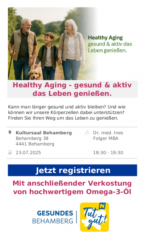 In einem spannenden Vortrag im Kultursaal Behamberg erfahren Sie am 23.07.2025 unter der Leitung von Frau Dr. med. Ines Folger MBA alles Wissenswerte zum Thema "Healthy Aging" und den essentiellen Baustein Omega 3: