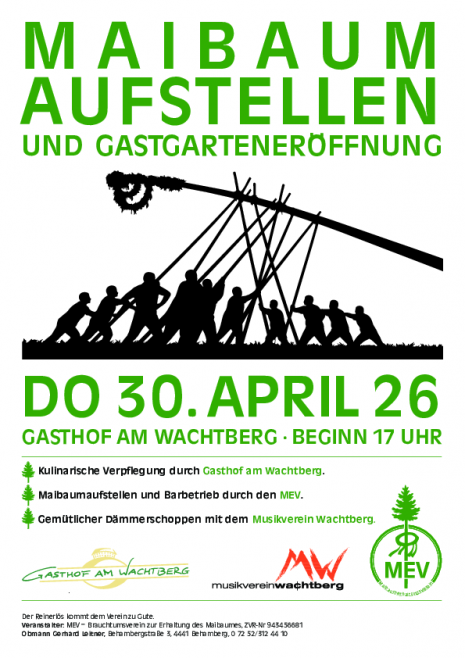 Kulinarische Verpflegung durch Gasthof am Wachtberg. Maibaumaufstellen und Barbetrieb durch den MEV. Gemütlicher Dämmerschoppen mit dem Musikverein Wachtberg.