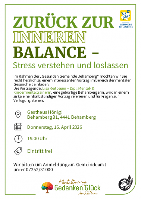 Im Rahmen der „Gesunden Gemeinde Behamberg“ möchten wir Sie recht herzlich zu einem interessanten Vortrag im Bereich der mentalen Gesundheit einladen.