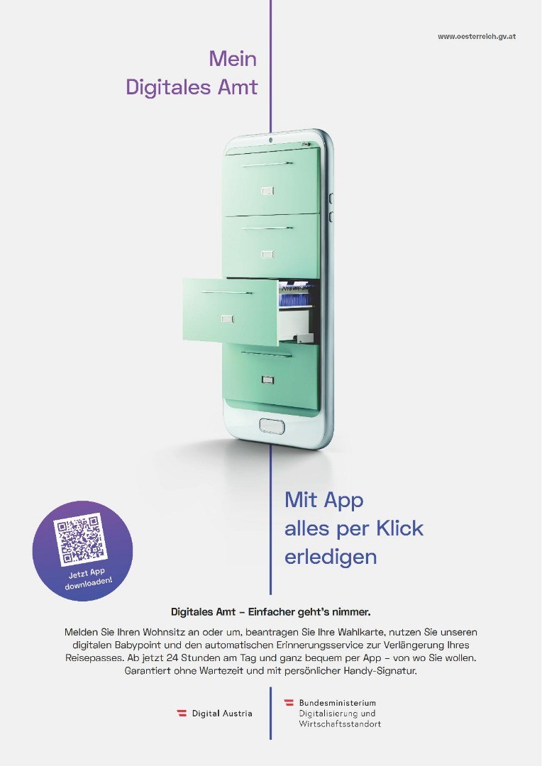 Die Plattform www.oesterreich.gv.at kann einfach am Desktop oder mobil über das Smartphone genutzt werden. Noch mehr Komfort bietet die aus den App-Stores kostenlos herunterladbare Verwaltungs-App mit dem Namen „Digitales Amt“: Damit wird die Zukunft der Verwaltung – Mobile First – erlebbar: Denn über diesen zentralen Zugang ist das gesamte digitale Informationsangebot des Bundes uneingeschränkt zugänglich. Dort finden sich auch sämtliche digitale Amtsservices, die mit der Handy-Signatur über Face- oder TouchID jederzeit und überall nutzbar sind. Die App ist auch eine Investition in die Zukunft: Bald wird man darin Dokumente (rechts)sicher speichern können.