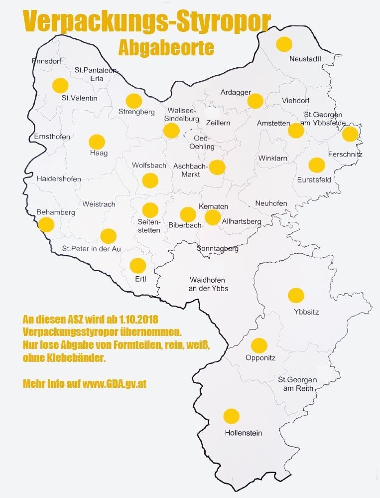 Die Übernahme von Verpackungsstyropor erfolgt auf folgenden Altstoffzentren: Amstetten Ost, Amstetten West, Ardagger, Behamberg, Biberbach, Ertl, Euratsfeld, Ferschnitz, Haag, Hilm, Hollenstein/Ybbs, Neustadtl/Donau, Opponitz, Seitenstetten, St. Peter/Au, Strengberg, St. Valentin, Wallsee-Sindelburg, Wolfsbach und Ybbsitz.