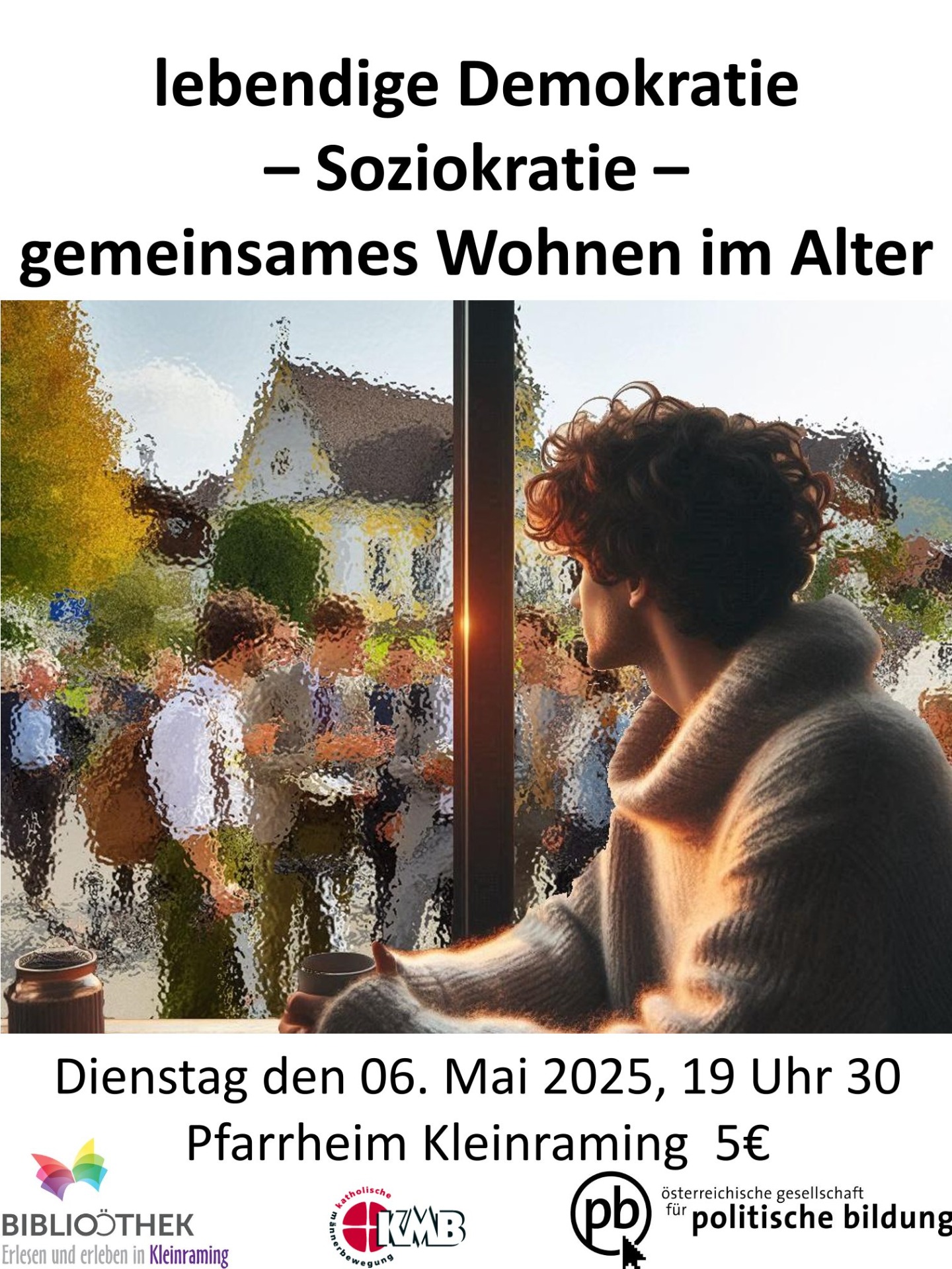 Am Dienstag, den 06.05.2025, lädt die Öffentliche Bibliothek Kleinraming zum Vortrag über Soziokratie ins Pfarrheim Kleinraming. Beginn der Veranstaltung ist um 19:30 Uhr. Besucherinnen und Besucher werden darüber informiert, wie lebendige Demokratie gelebt und gemeinsames Wohnen im Alter funktionieren kann. Für den Einlass ist ein Kostenbeitrag von € 5,00 zu entrichten.